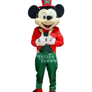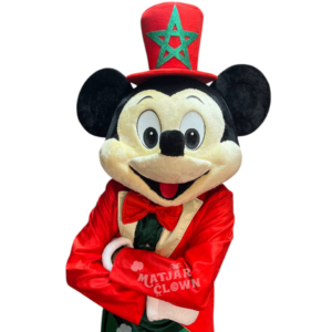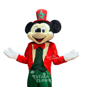 Mascotte Minnie Mouse nouvelle version, inspirée des couleurs du drapeau marocain rouge et vert. Cette mascotte professionnelle est idéale pour les événements, animations, fêtes nationales, écoles, centres commerciaux et spectacles.